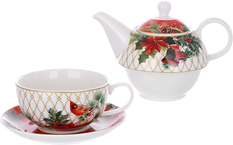 Різдвяний чайний набір на 1 персону чайник-заварник 350мл, яскрава чашка 300мл та блюдце (d=15.5х2см).