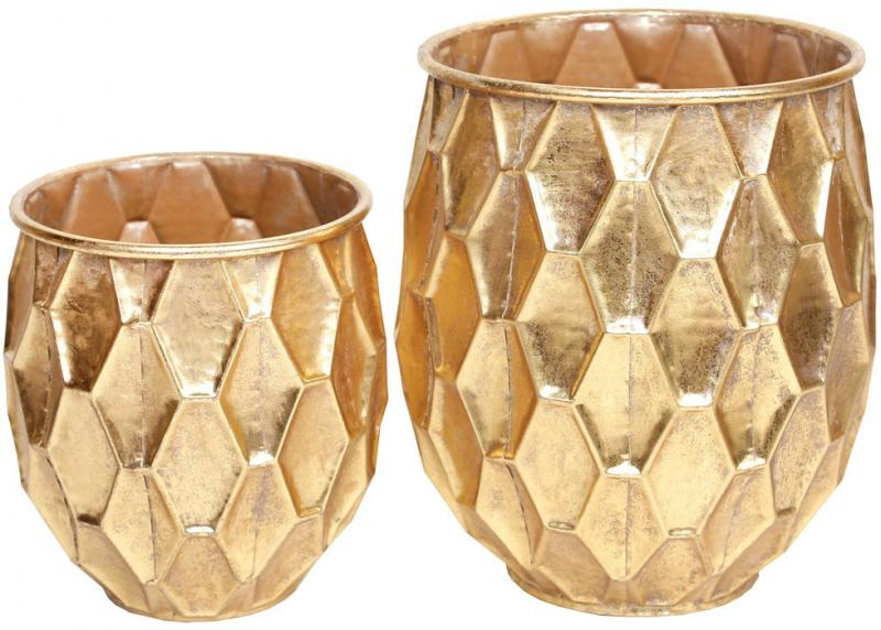 Набор металлических кашпо. В наборе 2 кашпо. Размер: 22.5х22.5х24см, 28.5х28.5х31.5см. Цвет: золото. Набор кашпо упакован в картонную коробку.