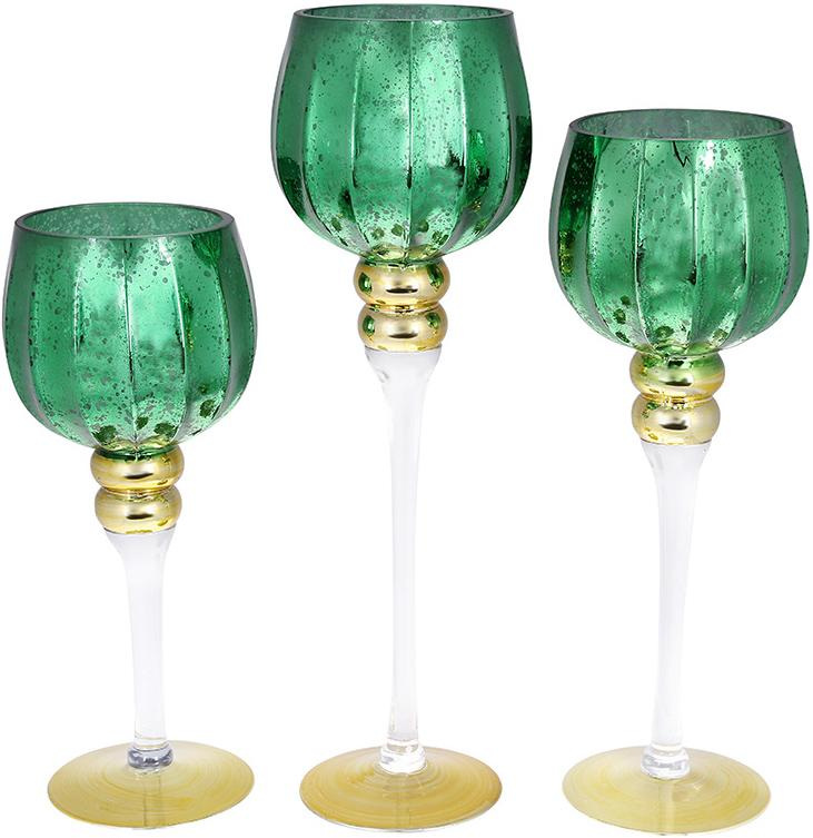 Подсвечники стеклянные выполнены в виде цветных бокалов. Материал - цветное стекло. Цвет наружный - зеленый с золотом. В наборе 3 подсвечника высотой 30см (диаметр=13см), 35см (диаметр=13см) и 40см (диаметр=13см). Подсвечники упакованы в подарочную безопасную коробку с пенопластом.
