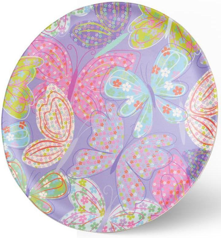 Тарелка плоская из бамбукового волокна - чрезвычайно удобная и легкая. Диаметр 28см, глубина 1.2см. Тарелка украшена рисунком из бабочек и цветов на лиловом фоне. Бамбуковое волокно - это природный материал, экологически абсолютно безвреден, легок и прочен, его невозможно разбить. В изготовлении используются только натуральные безопасные краски. Вам обязательно понравится такая стильная тарелочка!