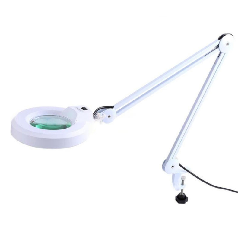 Лупа на струбцине круглая настольная с подсветкой предназначена для визуального увеличения различных мелких предметов или их фрагментов. Она используется в косметологии, маникюре в биологии и медицине. Такая оптическая система состоит из линзы, удобного пантографического механизма и бестеневой подсветки. Основные преимущества: Встроенный блок управления, благодаря которому, лампа излучает ровный свет без мерцания. Струбцинное крепление к столу. Зафиксирует лампу-лупу на любой плоской поверхности. Увеличенный срок службы. Достигается за счет использования светодиодной люминесцентной подсветки. Головка объектива может вращаться влево и вправо на 360 градусов и поворачиваться вверх и вниз на 180 градусов Выключатель питания Удобно регулируемая высота и рукоятка для увеличения в любом положении Характеристики: Увеличение: 5 дптр. Цвет: белый. Диаметр линзы: 12.7 см. Мощность: 25 Вт. Высота: 104 см. Напряжение: 110 В. Частота: 60 Гц.