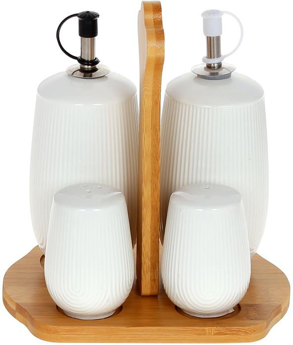 В комплекте 4 спецовника: 2 емкости для жидких специй (масла и уксуса) с пластиковыми колпачками, солонка и перечница.