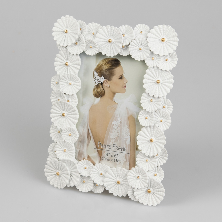 Чарівна фоторамка з об'ємними білими квітами із золотою намистинкою по центру, стане чудовим доповненням фото сім'ї, доньки, бабусі, подруги.