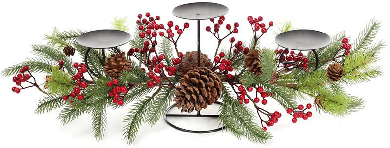 Новорічний свічник Червоні ягоди з шишками на 3 свічки.