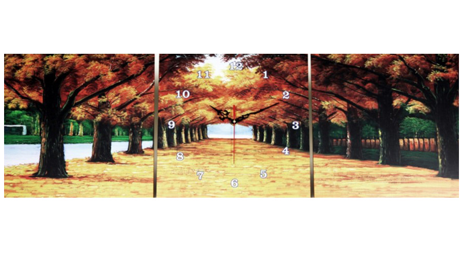 В наш час настінні годинники стали скоріше доповненням і прикрасою інтер'єру, так як часто люди вибирають годинник взагалі без індексів, а лише зі стрілочками. Проте стіну прикрашає практично картина, за якою можна ще й час вгадати. Яку годину можна завжди подивитися на руці, на мікрохвильовій печі, в телефоні, але стіна так не стане оригінальніше і привабливіше. Картина годинника складається з трьох окремих модулів, розмір кожного 30*30 см, в один з яких встановлений гарний, тихий годинниковий механізм із «плаваючою» секундною стрілкою. Модулі виготовлені із МДФ, з тильного боку облагороджені.