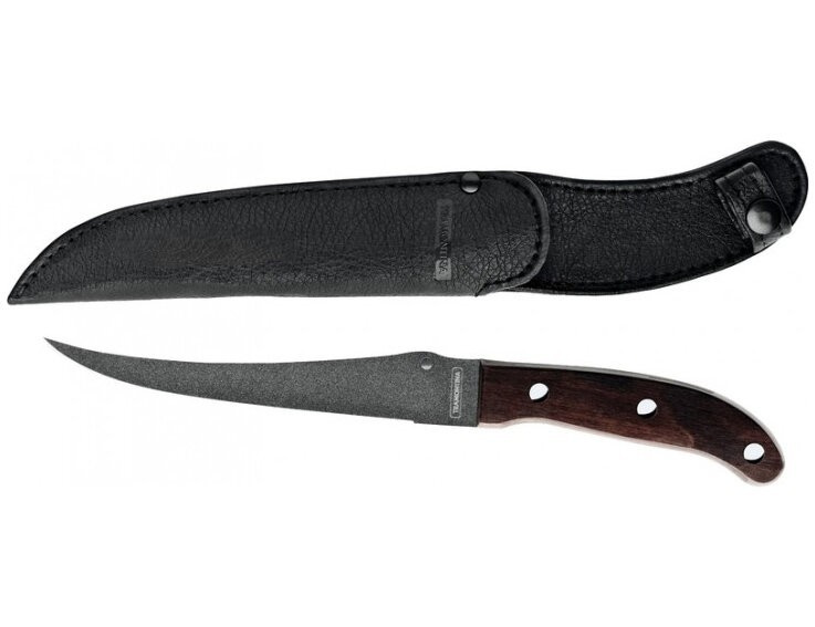 Нож Tramontina Fish станет надежным помощником для рыбака. Оригинальная и практичная рукоятка выполнена из твердых пород древесины. Для изготовления ножа применяется высококачественная инструментальная нержавеющая сталь с Starflon Plus покрытием. В комплект входит чехол из искусственной кожи с петлей, за которую нож можно подвесит на ремень.