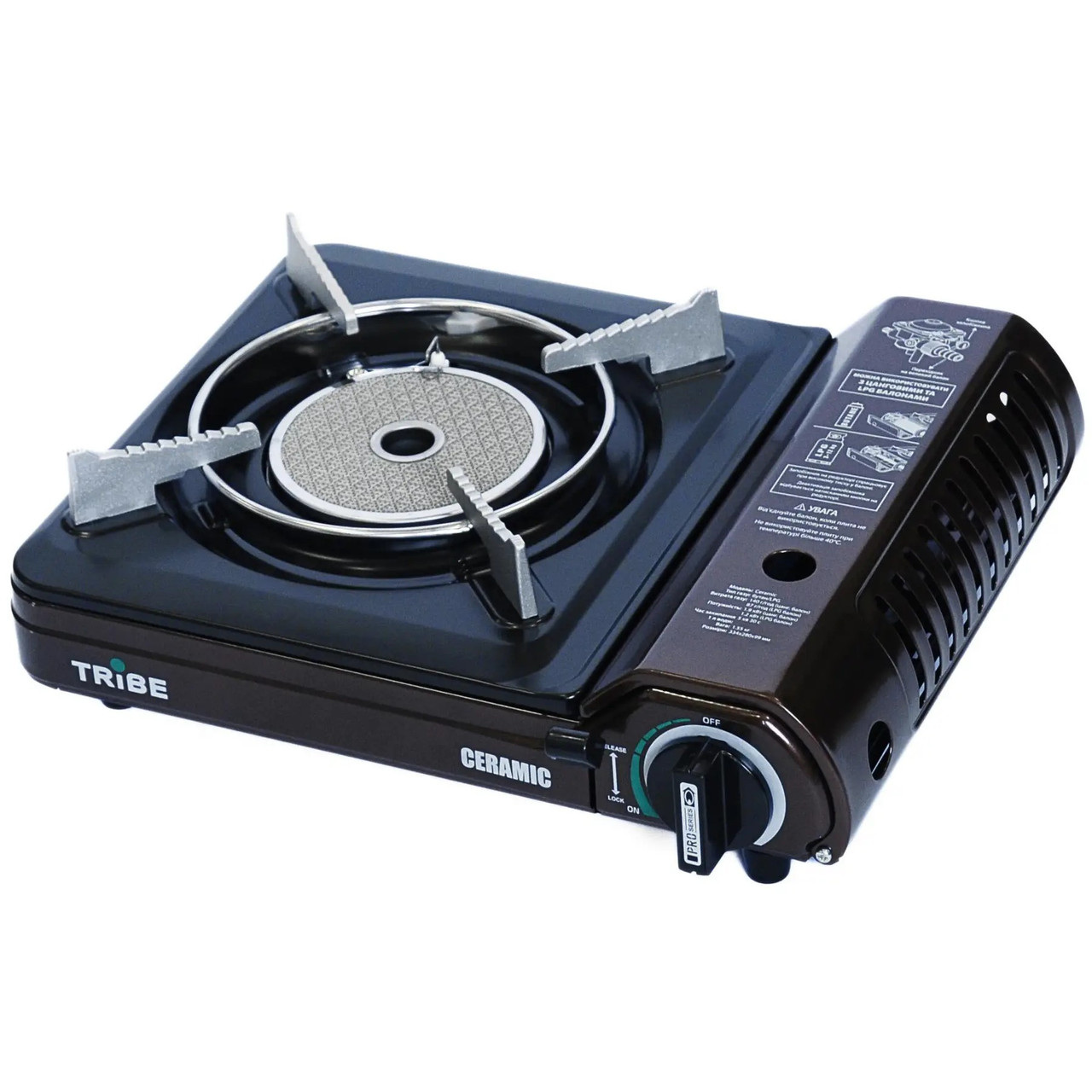 - Комплектація: Газова плита Tribe Ceramic, пластиковий кейс для транспортування та перехідник на побутовий балон.