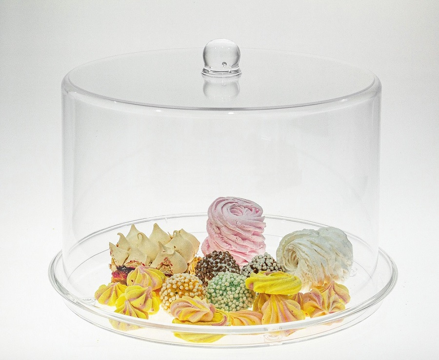 Материал: акрил Высота общая: 25 см Высота крышки: 21 см Диаметр крышки: 31 см Диаметр подставки: 34 см Глубина подставки: 2 см Цвет: прозрачный Вес: 1,25 кг Подходит для мытья в посудомоечной машине