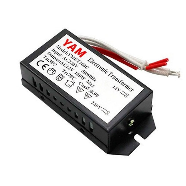 Електронний трансформатор YAM YMET160C використовується для живлення галогенних ламп загальною потужністю до 160 Вт при напрузі живлення 12 В змінного струму від побутової мережі 220 В змінного струму. Він має металевий корпус та чотири дроти. Червоний провід використовується для підключення вхідної напруги від електричної мережі 220 В змінного струму. Білий провід використовується для підключення навантаження загальною потужністю до 160 Вт та напругою 12 В змінного струму. Довжина дротів становить 110 мм. Не рекомендується вмикати прилад без навантаження. Трансформатор є джерелом високочастотних перешкод електромережі. Тому рекомендується встановити фільтр на вході приладу для блокування перешкод. Підходить лише для використання у приміщенні. Не підходить для живлення світлодіодного освітлення через коливання вихідної напруги.