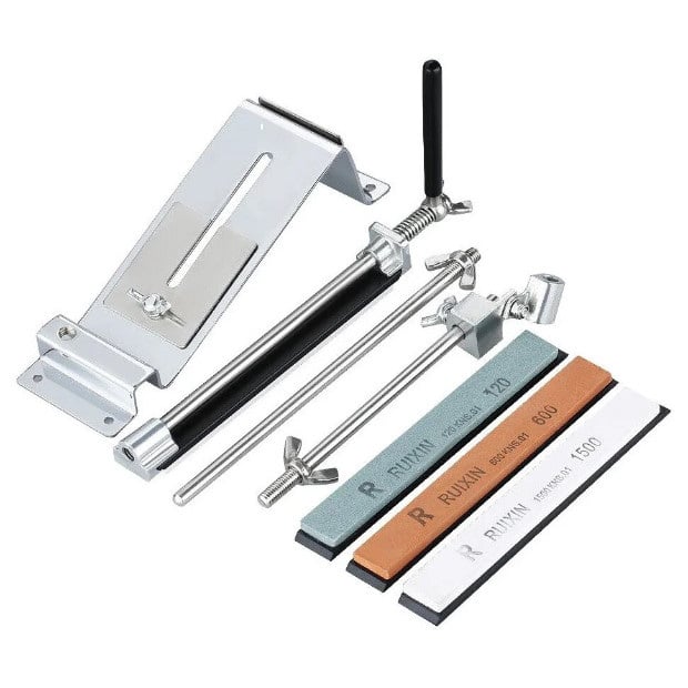 Точилка Ruixin Pro III дозволяє швидко і якісно зробити заточення, під різним кутом: ножів, тесаків і навіть ножиць практично будь-яких розмірів. У комплектацію входять відразу 4 точильні камені із зернистістю: 120, 320, 600 і 1500. Стругачка досить компактна, а також має збірну конструкцію з нержавіючої сталі (складання/розбирання займає від сили хвилину). Основна платформа має чотири отвори для кріплення її до столу або іншої стійкої горизонтальної поверхні. До платформи кріпиться вертикальна штанга, на якій розміщується шарнірне кріплення горизонтальної штанги (що складається з двох лозин, з'єднаних різьбовим з'єднанням). На горизонтальній штанзі встановлені затискачі для точильного каміння, з одного боку розміщена пружина для швидкої та зручної зміни каміння. На кінці горизонтальної штанги встановлено пластикову ручку. Вона розташована таким чином, що під час роботи з пристроєм порізатися практично неможливо. Леза ножів можна закріплювати на основній платформі горизонтально або вертикально. Для затискачів у всіх місцях точилки використовуються гайки-баранчики.