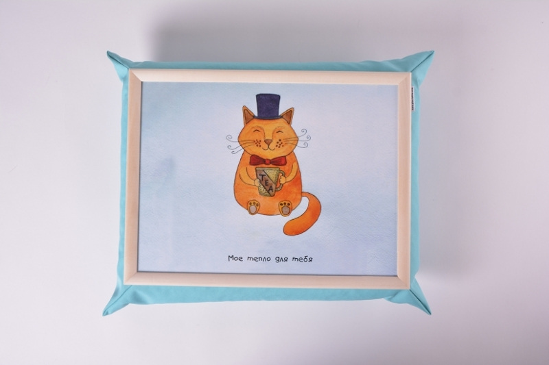 Этот столик на подушке можно использовать при работе в постели и на диване, с ним удобно попить кофе и поработать за ноутбуком. Благодаря большой подушке, которая сшита из мягкого вельвета (100% хлопок) и заполнена пенопластовым наполнителем столик можно разместить на любой поверхности под углом для более комфортной работы. Столешница изготовлена из устойчивого и пластического акрила, который не боится деформаций, в отделке с высококачественной древесины. Под столешницей расположен яркий принт, на котором можно разместить ноутбук с диагональю 15,6 дюймов. Уход: рекомендуется удалять пятна методом сухой чистки.