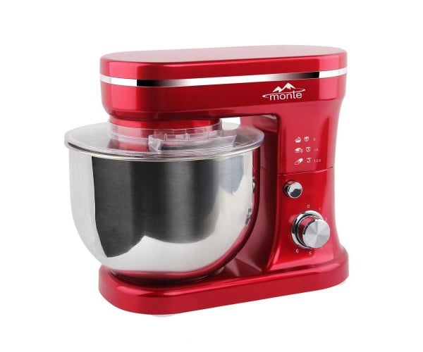 Кухонная машина Monte MT-2505 производится в современном дизайне в ярком красном цвете. Она может быть доминантой в кухне, добавляя интерьеру колоритности и выразительности. Модель оборудована двигателем мощностью 1400 Вт, скорость которого регулируется 6 уровнями удобным поворотным переключателем. Продукты укладываются в чашу из нержавеющей стали марки AISI304 объёмом 5 литров. Она закрывается прозрачной крышкой с отверстием, через которое можно добавлять ингредиенты во время работы. Устройство комплектуется тремя насадками: крюком для замешивания теста, венчиком для взбивания и битером, чтобы выполнять тщательное смешивание. Высокая эффективность прибора достигается ещё и планетарным способом вращения насадок, когда движение их производится вдоль края дежи с одновременным вращением вокруг своей оси. Кухонная машина Monte MT-2505 установлена на нескользящие прорезиненные ножки, обеспечивающие её устойчивость и безопасность.
