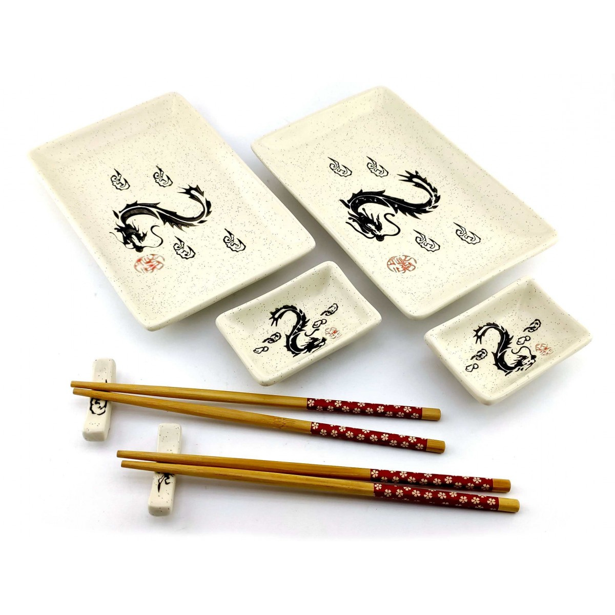 Набор рассчитан на две персоны, в наборе две керамические тарелки прямоугольной формы. Легкие и гладкие бамбуковые палочки, два комплекта, которые не размокают и не деформируются при правильном хранении. Две керамические подставки для палочек. Две керамические соусницы.