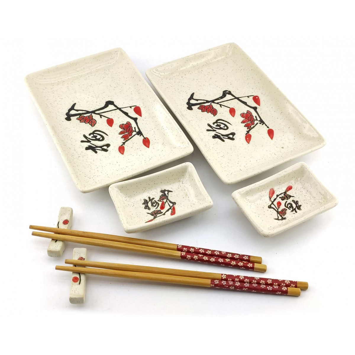 Набор рассчитан на две персоны, в наборе две керамические тарелки прямоугольной формы. Легкие и гладкие бамбуковые палочки, два комплекта, которые не размокают и не деформируются при правильном хранении. Две керамические подставки для палочек. Две керамические соусницы.