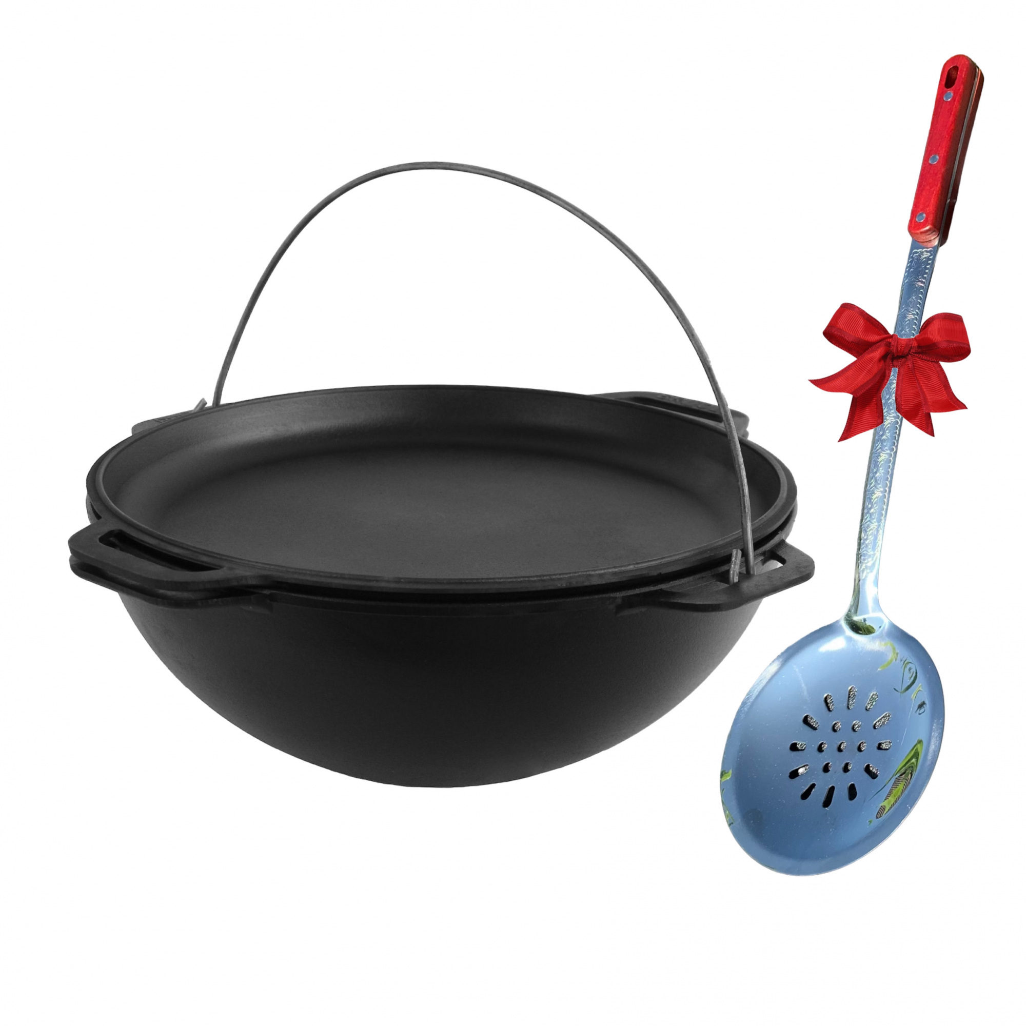 Казан чугунный азиатский 12 л с крышкой-сковородой и шумовкой в комплекте Brizoll, Бризол (КА12-3Ш)