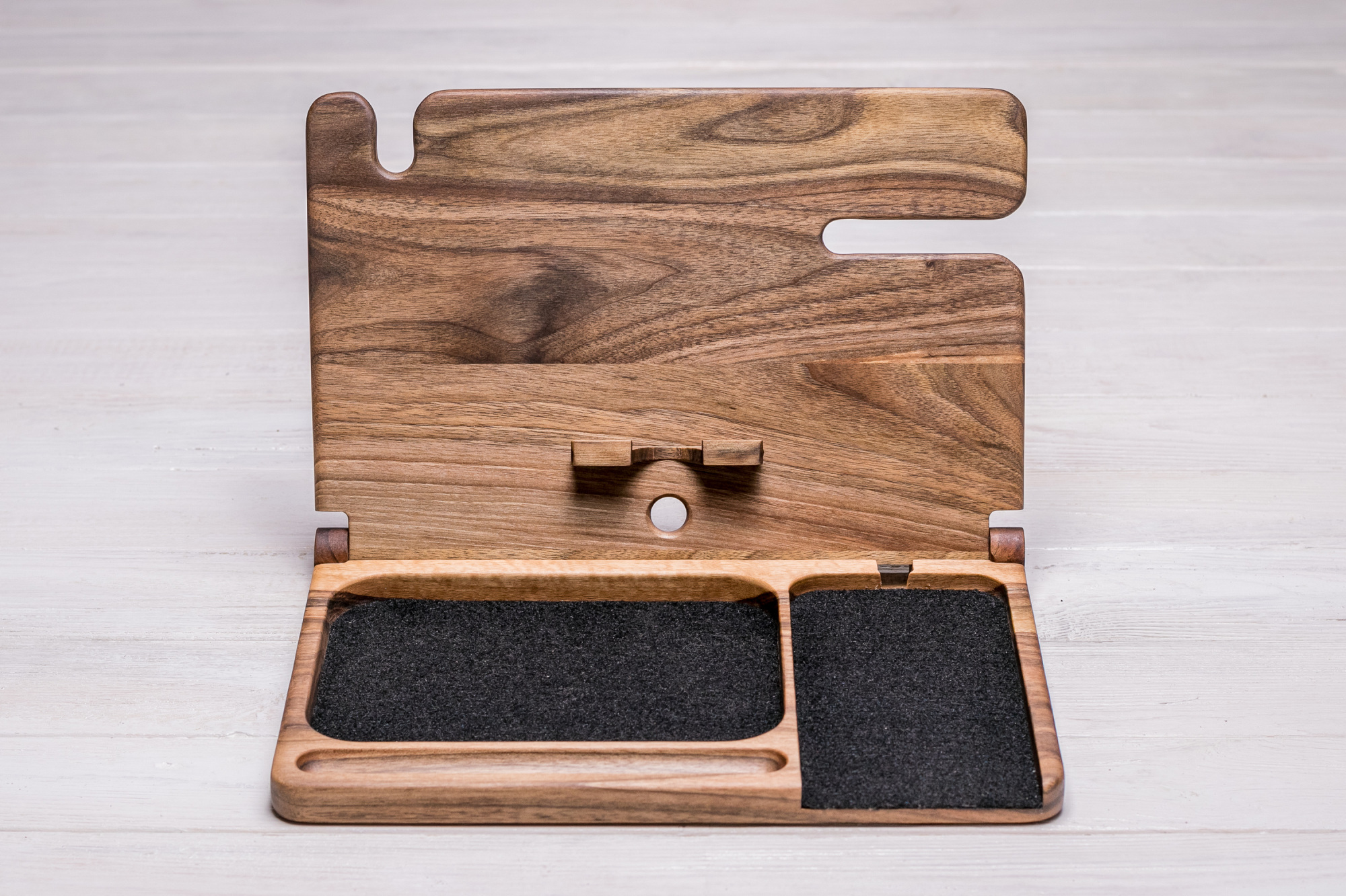 Представляем Вам деревянный настольный органайзер для Ваших аксессуаров. Главной особенностью этого органайзера является встроенная беспроводная зарядка для Вашего гаджета по технологии QI [мощность до 10 Вт]. Вам достаточно подключить органайзер кабелем к сети и просто положить телефон на Вашу подставку - далее процесс зарядки гаджета начнется автоматически. Легким движением руки органайзер складывается по типу книжки за счет металлических шарниров и занимает очень мало места. Тут найдется место как для телефона и планшета, так и для ручек, ключей, визиток и прочих мелочей, которые обычно теряются на рабочем столе. А для максимально удобного хранения очков и часов мы сделали плавно обтекаемые вырезы в верхней части органайзера, которые не только практичны в использовании, но и стильно смотрятся.