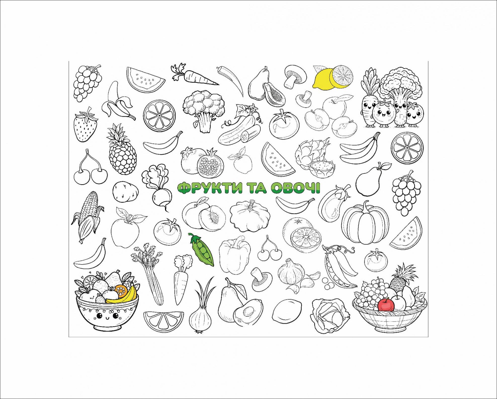 Эта раскраска содержит черно-белые изображения разнообразных фруктов и овощей, в том числе яблок, груш, бананов, лимонов, арбузов, грибов, моркови, капусты, помидоров и др. В центре размещено заголовок "ФРУКТЫ И ОВОЩИ", выполнен в зеленом цвете. Изображения детализированы, чтобы дети могли легко узнавать каждый продукт.