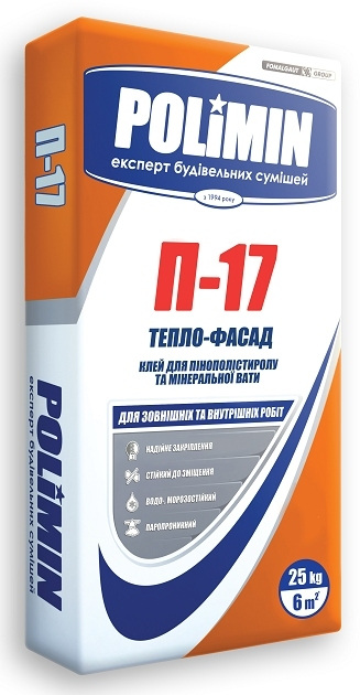Характеристики товару Клей для пенопласта и минеральной ваты POLIMIN П-17 ТЕПЛО-ФАСАД 25 кг