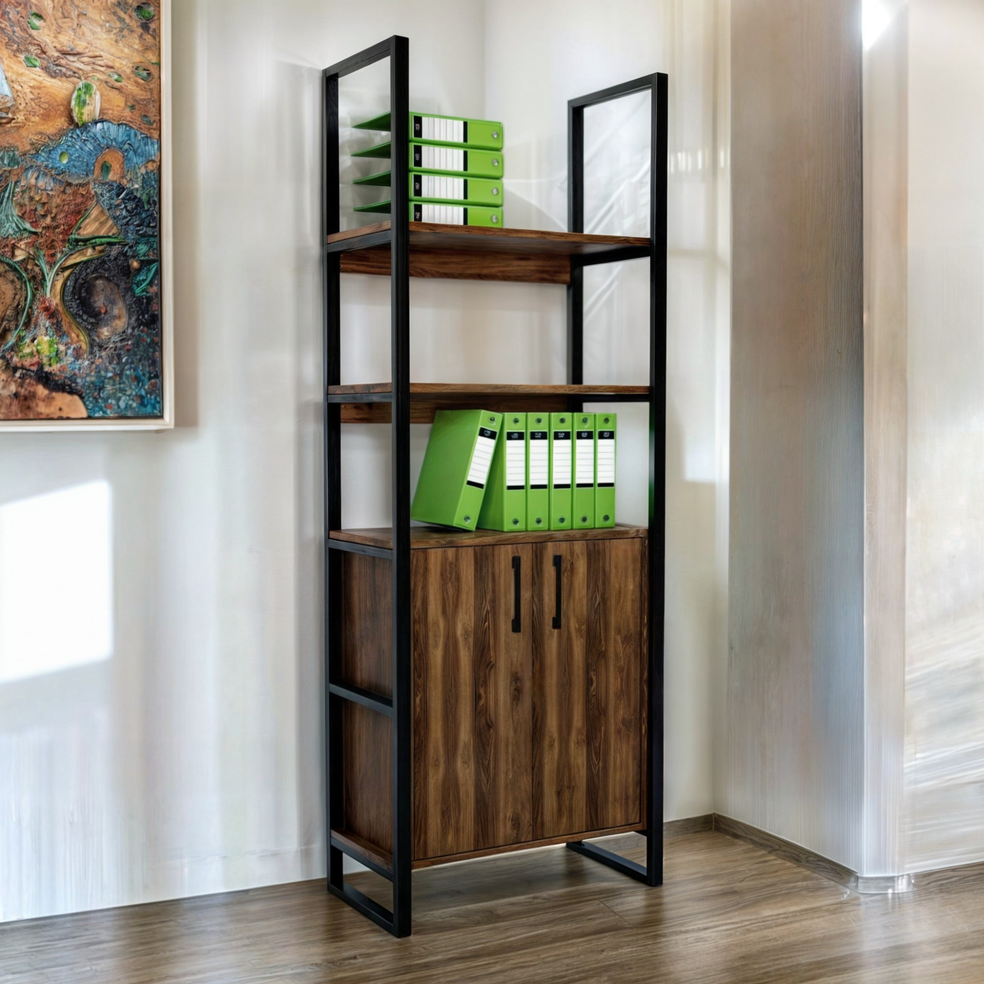Офісні стелажі в стилі Лофт поєднують металеві опори з текстурою натурального дерева, створюючи сучасний індустріальний вигляд, що гармонійно вписується в будь-який робочий простір.