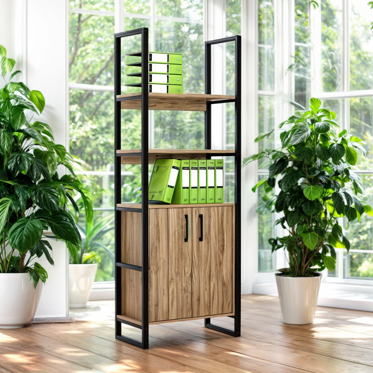 Офісні стелажі в стилі Лофт поєднують металеві опори з текстурою натурального дерева, створюючи сучасний індустріальний вигляд, що гармонійно вписується в будь-який робочий простір.