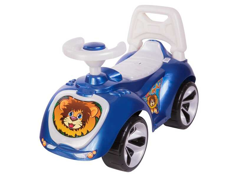 Машинка выполнена из пластика, окрашена в яркие цвета (синий, зеленый, красный и сиреневый) и оформлена забавными изображениями животных (львенок и медвежонок).