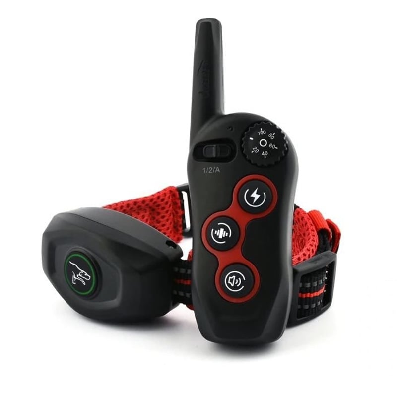 Пульт дистанционного управления имеет компактные размеры, удобно лежит в руке и имеет крепление на пояс. Ним вы выбираете один из трёх видов воздействия - ток, звук, вибрация. Поддерживается работа с двумя ошейниками, каждый из которых имеет свой канал. Питание также от встроенного аккумулятора. При разряде батарей ошейника и пульта есть световая и звуковая сигнализация. Длительность работы зависит от интенсивности использования.