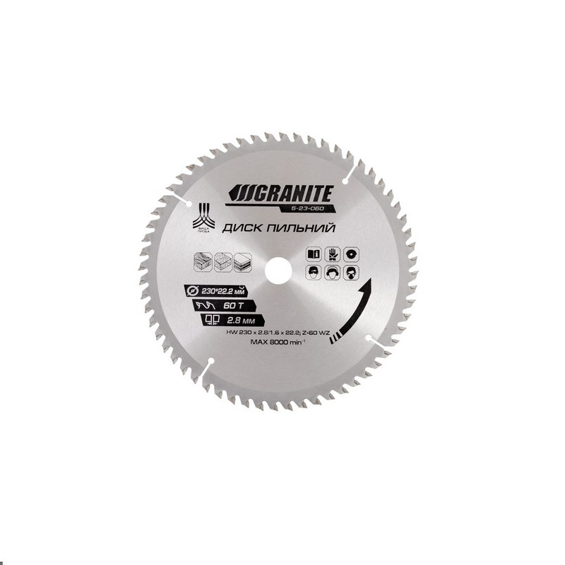 Диск пильний GRANITE для дерева з твердосплавними напайками 230х22.2х60Т 8000 об/хв 5-23-060
