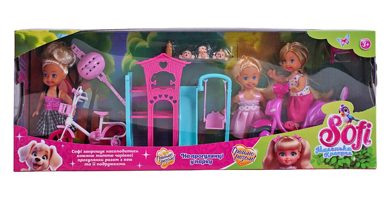 Набор кукол Sofi На прогулке в парке, 3 куклы, мопед, велосипед, детская площадка, высота куклы 11 см. Multicolor (155343)