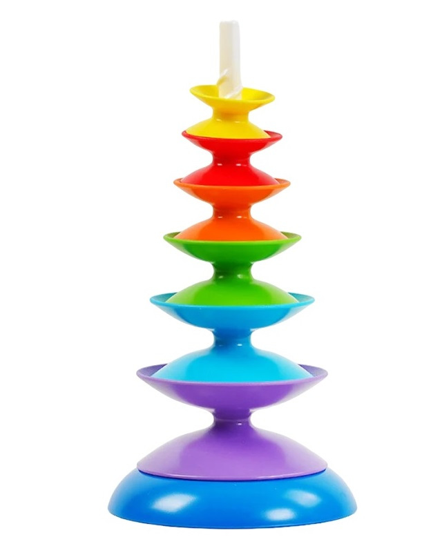 «Крутая пирамидка» отличается конструкцией стержня в форме винта, на которую один за другим накручиваются цветные элементы разного размера.