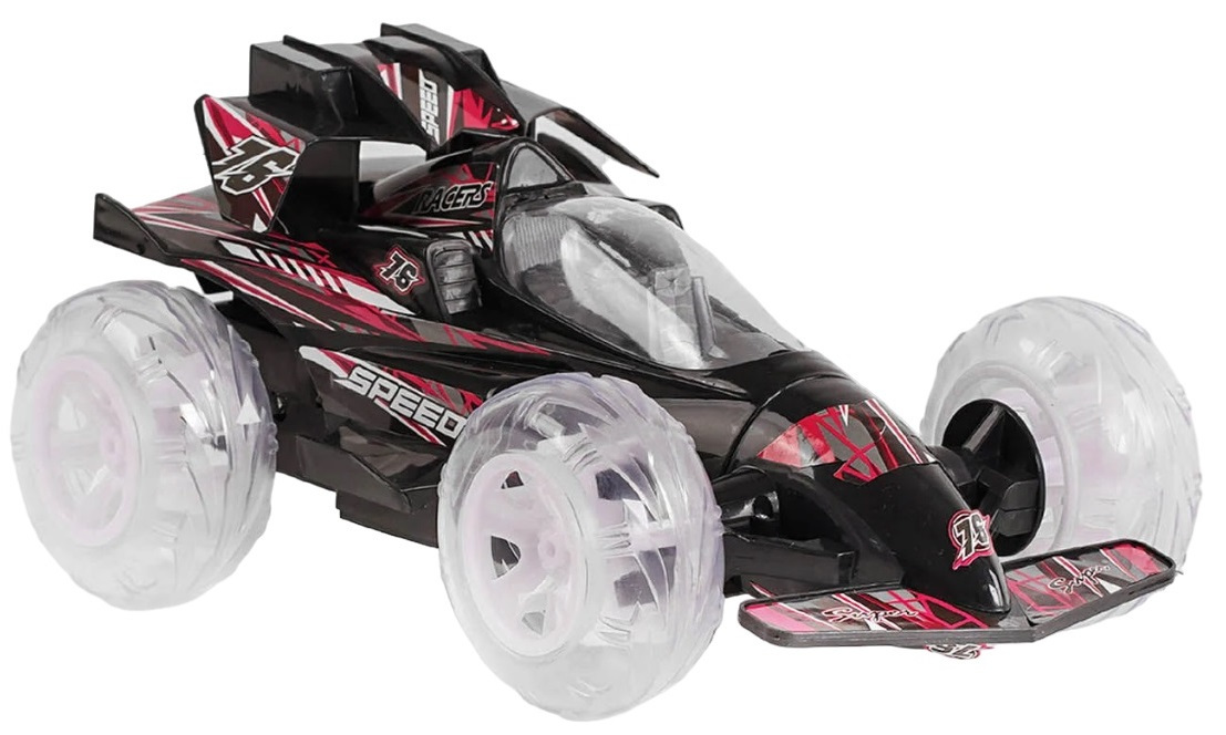 Стильный корпус, украшенный яркими наклейками, прозрачные колеса, звуковое и световое сопровождение во время езды делают игрушечный болид «Stunt Racing» просто непревзойденным.