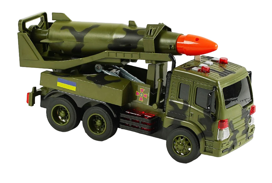 - 4 функциональные кнопки на крыше кабины активируют звуковые эффекты: звук поднятия ракетного комплекса, сигнал, задний ход, звук зажигания двигателя (батарейки прилагаются);