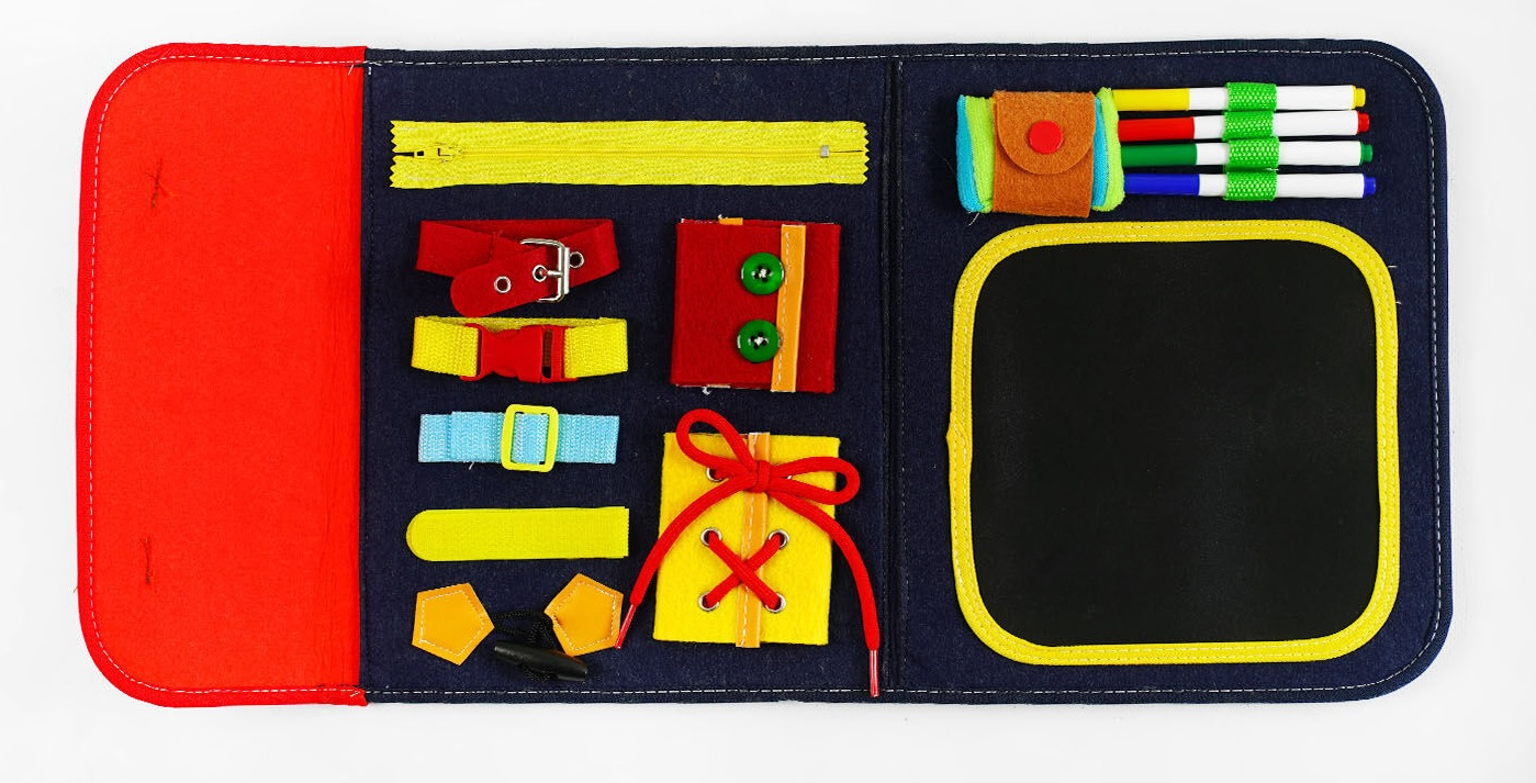 Эта развивающая игрушка позволит вашему ребенку весело и легко научиться справляться с разными видами застежек на одежде и поможет ему разобраться, как одеваться самому. Также в папке есть дощечка для рисования и четыре ярких маркера к ней. Игрушка выполнена в форме рюкзачка с лямками, длина которых регулируется, поэтому малышу будет удобно брать ее с собой.