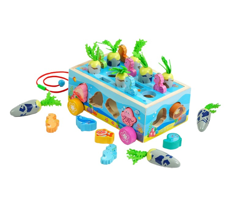 - к игрушке добавляется шнурок для каталки, 2 ярких удочка, 8 овощей, 12 фигурок животных и 8 морских коньков;
