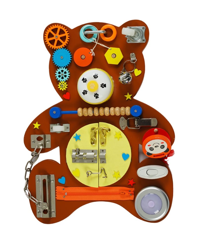 Включай, крути, открывай! Большой тематический бизиборд легко привлечет внимание малыша: исполненный в виде мишки, он включает множество различных мини-игр. Колокольчик, лампа, шестеренки колесики и много других достопримечательностей, которые будут способствовать развитию мелкой моторики рук и логического мышления, познакомят с новыми тактильными ощущениями и разными формами. Ребенок с удовольствием будет учить каждый механизм!