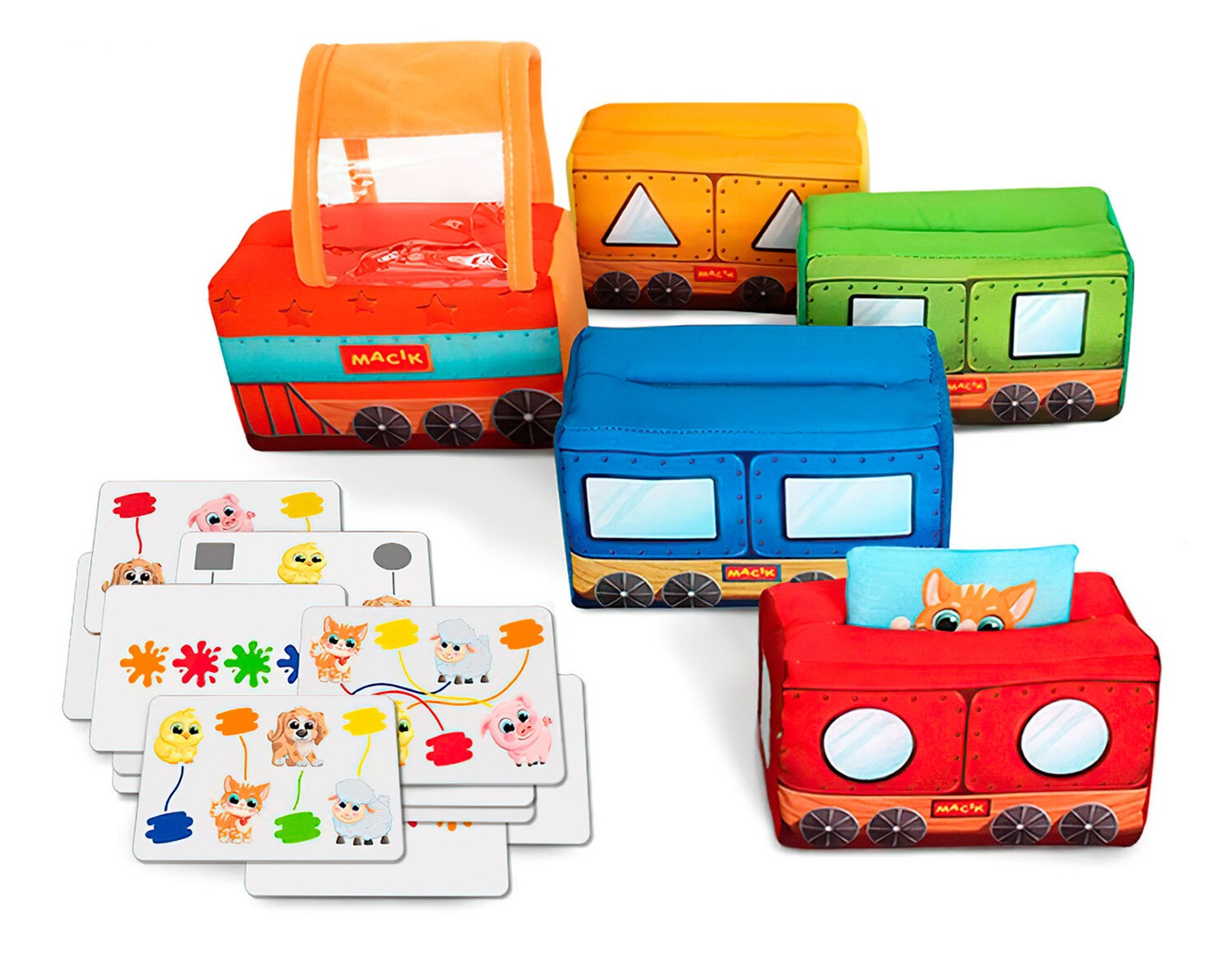 Мягкая развивающая игрушка Паровозик Масик, 5 кубиков, карточки. Разноцветный (132154)