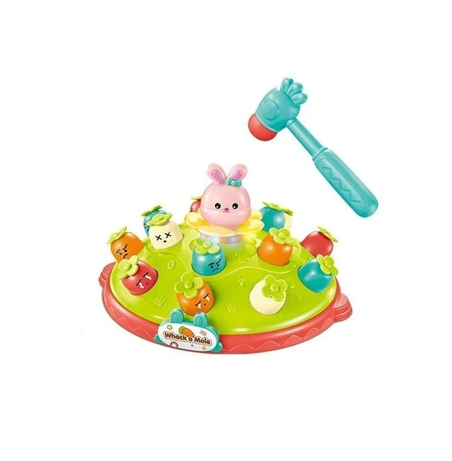 Кто выглядывает из зеленого холма? Интересны морковки с разными эмоциями и цветочками на голове. Нажмите на элемент по центру так, чтобы он вошел внутрь, вставьте милую фигурку кролика и стучите по морковкам на холме так, чтобы кролик вылетел. Во время игры игрушка подсвечивается и исполняет песенку на английском.