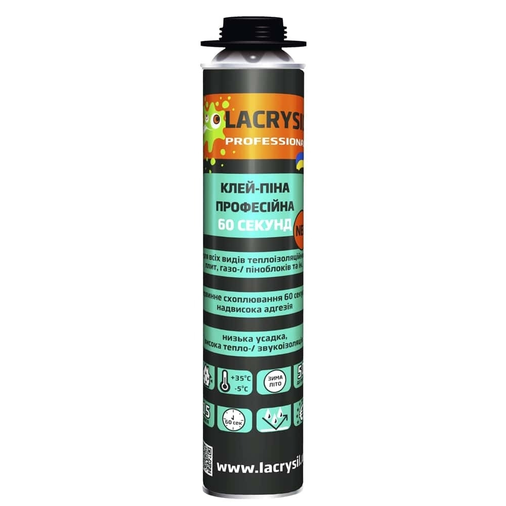 Характеристики товару Клей-пена LACRYSIL 60 секунд профессиональная 800 мл