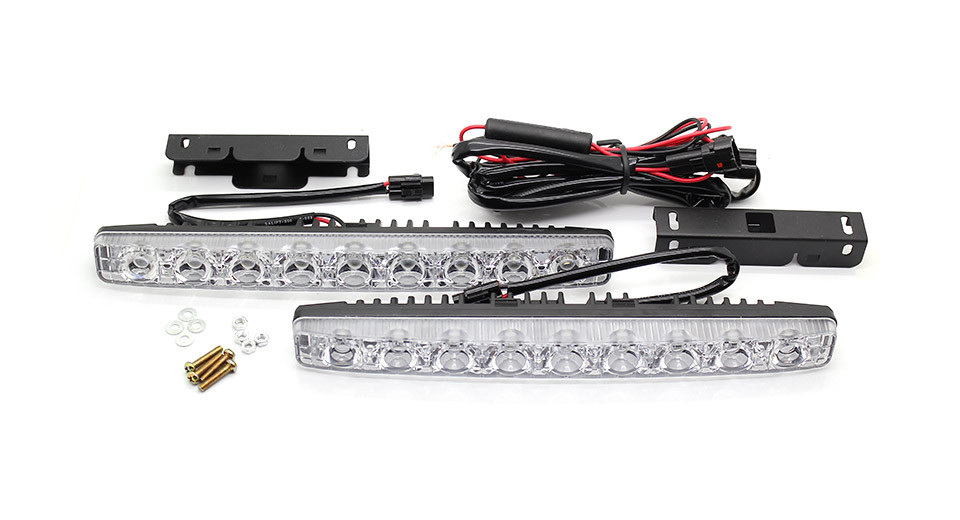 Характеристика: Угол свечения: 120°В каждой планке 9 диодов Срок службы до 50000 часов Цвет 8000К Потребляемая мощность - 9 Ват Размеры: Ширина - 25.3 см; Глубина 4.2 см; Высота 2.6 см Питание - 12В Длина провода 117 см Преимущества:Новый стильный дизайн Дополнительное освещение (Улучшает безопасность вождения в дневное и вечернее время)Энергосбережение Яркие Долгий строк работы (Срок службы в 20 раз больше чем в ксенона, в 50 раз чем галогенки)Комплектация:2 х ходовые огни 2 х крепление 2 х комплект проводов 4 х шуруп
