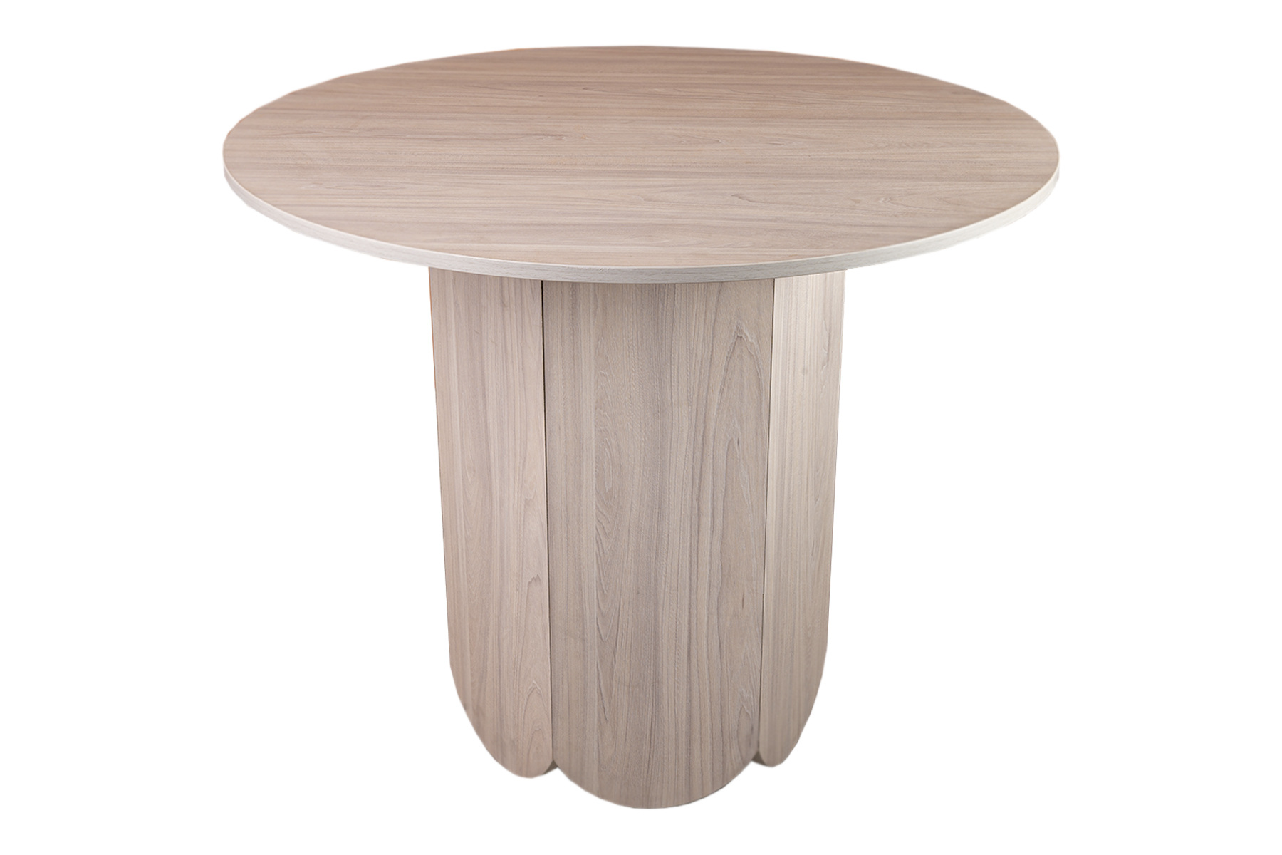 Обідній стіл LinenVault має круглу стільницю та основу з фігурними панелями. Завдяки розмірам 90 × 90 × 75 см, його можна розмістити у невеликій кухні, їдальні або зоні для сніданків.