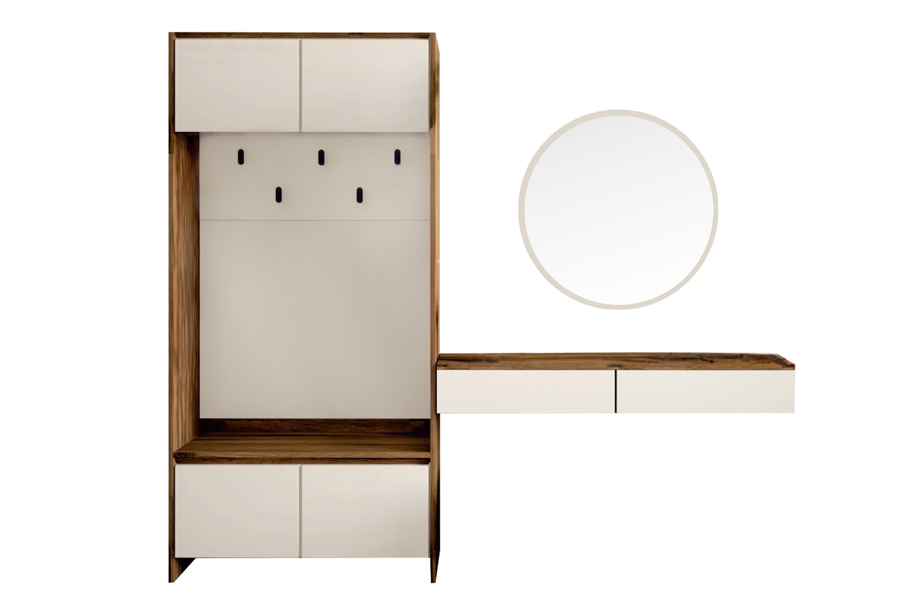 Набір SlateHearth створений для передпокою, де важлива функціональність і порядок. Комплект включає шафу з гачками для верхнього одягу, відділенням для взуття, містким верхнім відсіком, підвісну полицю з двома ящиками для аксесуарів та кругле дзеркало. Завдяки лаконічному дизайну елементи гармонійно поєднуються між собою та легко інтегруються в сучасний інтер’єр.