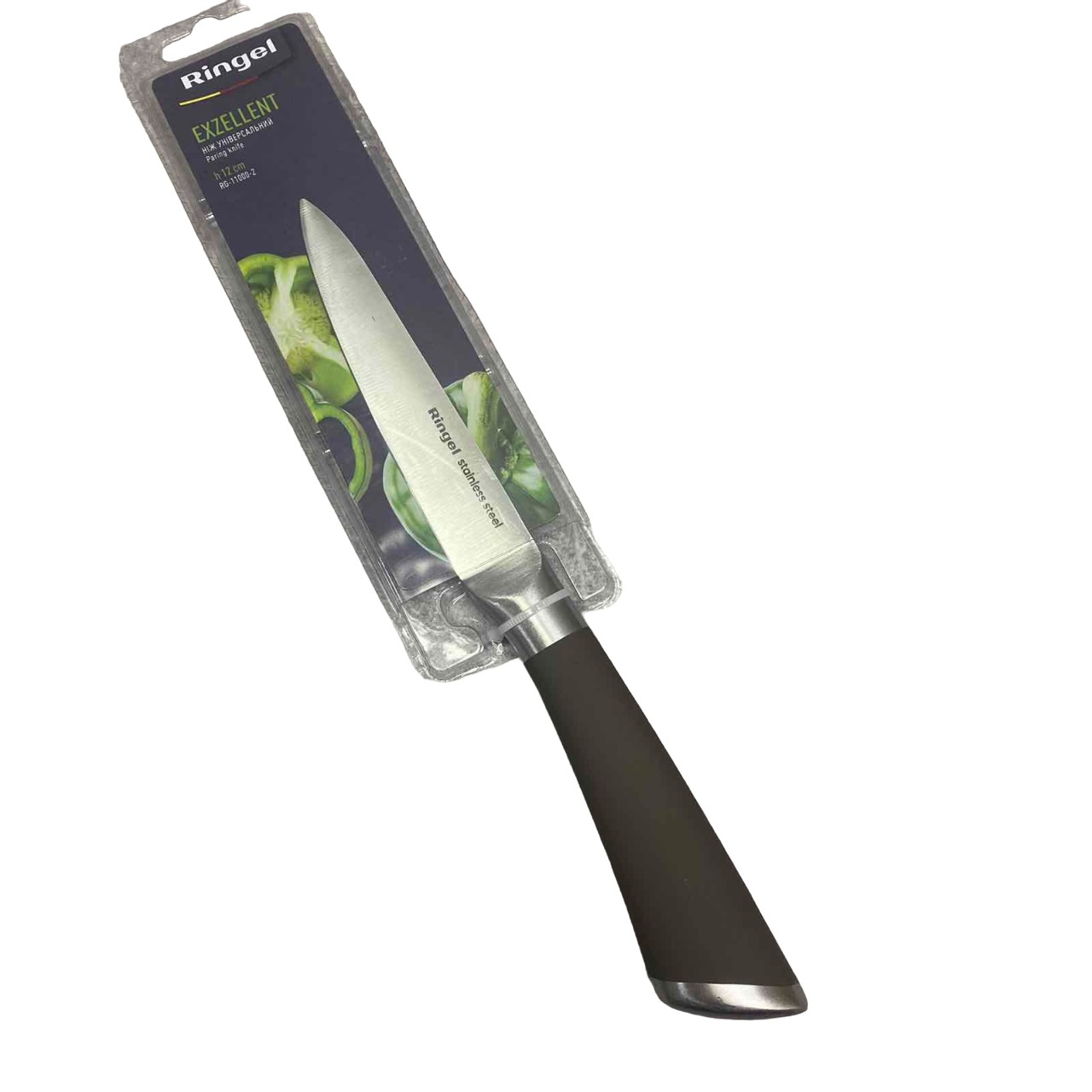 Ніж універсальний Ringel Exzellent RG-11000-2 Серія ножів Excellent торгової марки – Rignel – це добре збалансовані ножі правильної геометричної форми із цільнолитим корпусом та прогумованою ручкою. Мартенситна нержавіюча сталь (сталь AISI 420), з якої виготовлено лезо ножа, має високу міцність і корозійну стійкість. Ціліснолитий корпус ножів Excellent забезпечує максимально довге та надійне використання виробів на вашій кухні. Характеристика: Тип: Ніж Призначення: Для овочів Матеріал леза: Нержавіюча сталь Матеріал ручки: Нержавіюча сталь/силікон Тип кріплення ручки: Цільне лиття Колір: Сталевий/коричневий Довжина леза: 12 см
