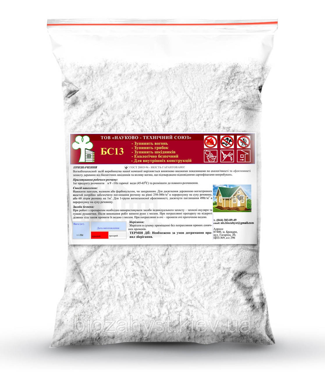 Антисептик антипірен БС13 фасується в поліетиленові пакети місткістю 1, 2, 5 кг. Або відра 5, 10 кг. Також за індивідуальним запитом можливий випуск готового антисептика БС13 в каністрах 5, 10, 20 кг.