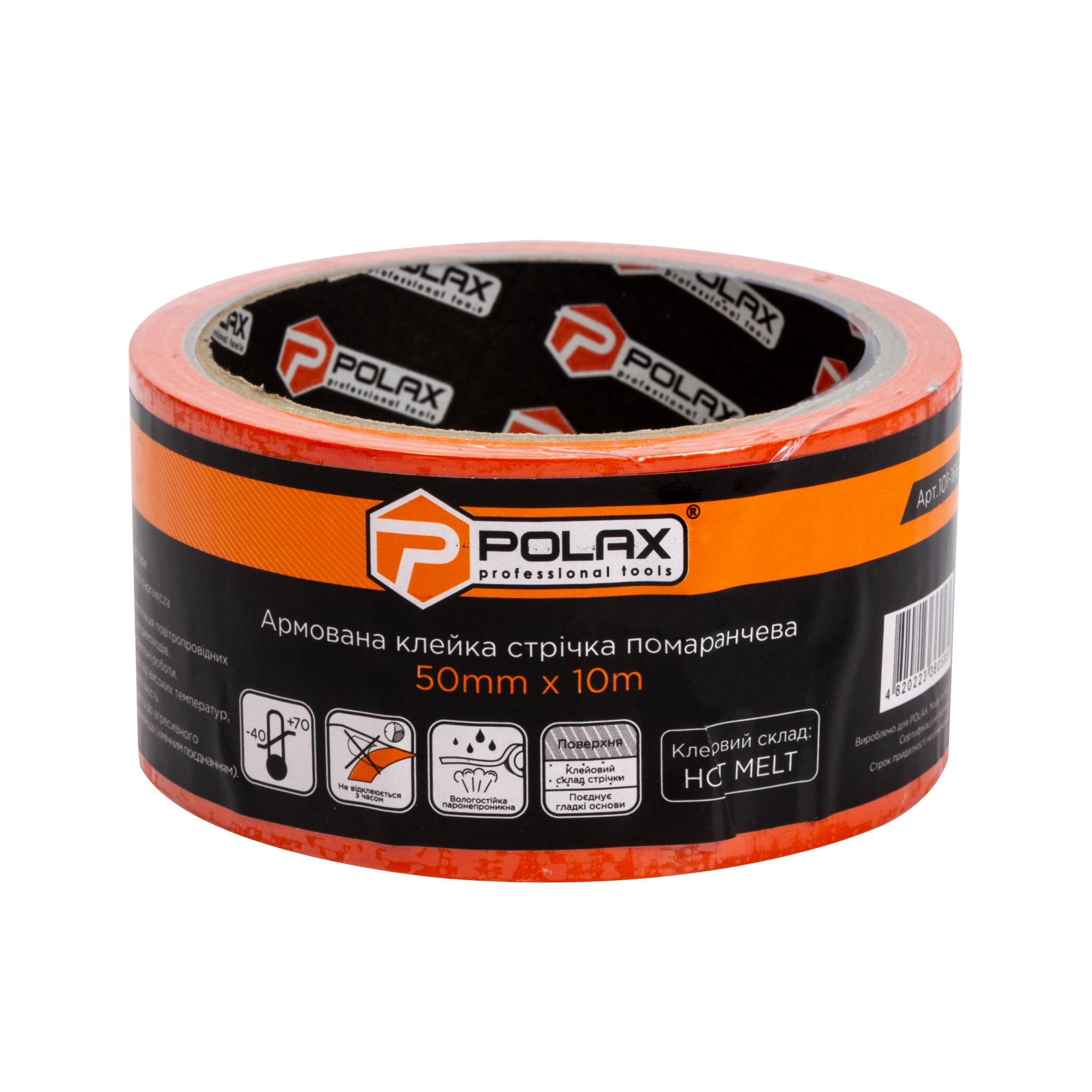 Армований скотч - універсальний вид будівельного скотчу, що відрізняється підвищеною міцністю, надійністю, еластичністю, ізоляційними та водонепроникними властивостями. Стрічку армовану можна використовувати при виконанні сантехнічних робіт Вона характеризується вологонепроникністю стійкістю до іржі і різних механічних навантажень Саме тому виріб відмінно підходить для герметизації труб, стикування швів і захисту повітряних каналів від вологості і води. У побуті клейка армована стрічка використовується для усунення пошкоджень на різних поверхнях. Виріб застосовується і при упаковці товарів, оскільки гарантовано захистить їх від потрапляння всередину вологи. Завдяки діелектричним властивостям стрічка армована відмінно підходить для ізоляції проводки, будівельних огорож, ремонту автомобілів і т. п. Стрічка армована складається з поліпропіленової основи, покритої клеєм з одного боку. Міцність виробу забезпечують тканинні волокна, які одночасно наділяють стрічку гнучкістю Незважаючи на складну технологію виготовлення, стрічка досить тонка, тому підходить для заклеювання навіть невеликих предметів і ділянок. Скотч армований Polax помаранчевий 50 мм х 10 м (101-168)