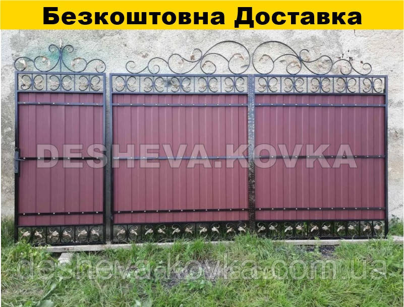 Ковані ворота з профнастилом та кованими елементами Код: А-0173 Ворота від виробника по вашим розмірам за 4 днів з БЕЗКОШТОВНОЮ доставкою курєром до вашого подвіря Ціни вказані за комплект воріт в стандартних розмірах, також можна виготоваити по індивідуальним розмірам. Представленна модель розпашних воріт виготовлена із якісного металевого профіля. Вся конструкція зашита металевим листом профнастила з ребрами жосткості. Такі ворота виготовляються на сучасному обладненні спеціалістами нашої компанії. Калітка може бути з правого боку або з лівого, або в центрі воріт по бажанню замовника. Подарок!!! Наведення бронзового і золотого відтінку Також можем виготовити ворота по фото яке Вам сподобалось в інтернеті. По бажанню замовника можна внести зміни в конструкцію воріт -Являємся одним з найбільших виробників на ринку України БЕЗКОШТОВНА ДОСТАВКА ПО ВСІЙ УКРАЇНІ Стандартні розміри: Ворота: 3.40х2.0м Калітки: 0,9х2.0м Також можна виготовити будь-яких нестандартних розмірів(ширше, вище, вуще, нище) В ціну входить: 1. Ворота 2. Калітка По бажанню замовника профнастил можна змінити на будь-який інший колір. Також можна внести зміни в конструкцію воріт (щось забрати або додати) Для консультації телефонуйте +380965364101