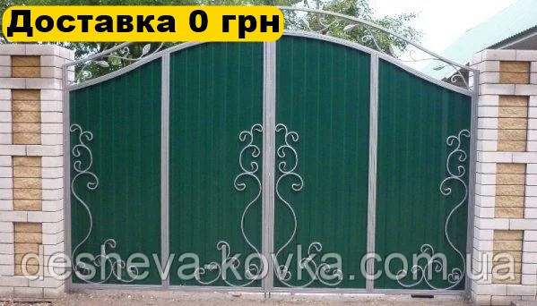 Кованые ворота из элементами ковки из профнастила Код: А-0154 Мы изготовим ворота индивидуально по вашим размерам за 4 рабочих дня. Наши ворота производятся на современном оборудовании специалистами нашей компании, что гарантирует скорость и качество. Уличные ворота из профнастила отлично подходят для обустройства въезда во двор частного дома. Классические конструкции не зря пользуются спросом на протяжении нескольких веков: они хорошо выполняют свои функции, оставаясь простыми и удобными в использовании. Изделие может иметь любую форму и дизайн: из-за его технических особенностей ограничений в возможностях декорирования практически нет. БЕСПЛАТНАЯ доставка по всей Украине! (Доставка курьером до Вашего дома, в любой город/село Украины.) По желанию заказчика калитка может быть справой или с левой стороны. Стандартные размеры: Ворота: 3.4м х 1.7м по столбикам. Калитка: 0.9м х 1.7м по столбикам. Также мы можем изготовить ворота индивидуально по размерам заказчика. Цвет профнастила по выбору! Наша компания является одним из самых больших производств на рынке Украины. Звоните и мы Вас проконсультируем +380965364101.