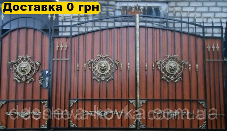 Кованые ворота из художественной ковкой из профнастила Код: А-0156 Мы изготовим ворота индивидуально по вашим размерам за 4 рабочих дня. Наши ворота производятся на современном оборудовании специалистами нашей компании, что гарантирует скорость и качество. Уличные ворота из профнастила отлично подходят для обустройства въезда во двор частного дома. Классические конструкции не зря пользуются спросом на протяжении нескольких веков: они хорошо выполняют свои функции, оставаясь простыми и удобными в использовании. Изделие может иметь любую форму и дизайн: из-за его технических особенностей ограничений в возможностях декорирования практически нет. БЕСПЛАТНАЯ доставка по всей Украине! (Доставка курьером до Вашего дома, в любой город/село Украины.) По желанию заказчика калитка может быть справой или с левой стороны. Стандартные размеры: Ворота: 3.4м х 1.7м по столбикам. Калитка: 0.9м х 1.7м по столбикам. Также мы можем изготовить ворота индивидуально по размерам заказчика. Цвет профнастила по выбору! Наша компания является одним из самых больших производств на рынке Украины. Звоните и мы Вас проконсультируем +380965364101.