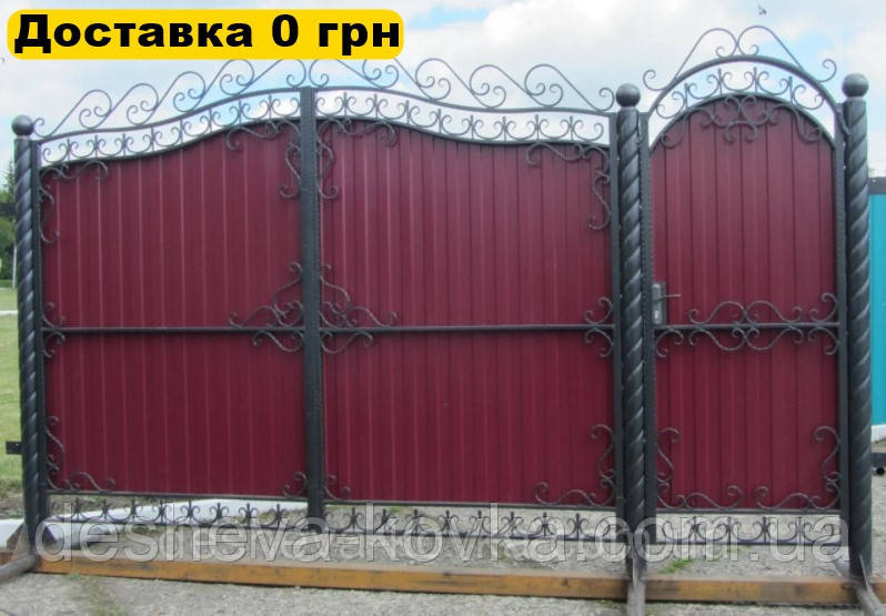 Кованые ворота из профнастила из коваными элементами Код: А-0157 Мы изготовим ворота индивидуально по вашим размерам за 4 рабочих дня. Наши ворота производятся на современном оборудовании специалистами нашей компании, что гарантирует скорость и качество. Уличные ворота из профнастила отлично подходят для обустройства въезда во двор частного дома. Классические конструкции не зря пользуются спросом на протяжении нескольких веков: они хорошо выполняют свои функции, оставаясь простыми и удобными в использовании. Изделие может иметь любую форму и дизайн: из-за его технических особенностей ограничений в возможностях декорирования практически нет. БЕСПЛАТНАЯ доставка по всей Украине! (Доставка курьером до Вашего дома, в любой город/село Украины.) По желанию заказчика калитка может быть справой или с левой стороны. Стандартные размеры: Ворота: 3.4м х 1.7м по столбикам. Калитка: 0.9м х 1.7м по столбикам. Также мы можем изготовить ворота индивидуально по размерам заказчика. Цвет профнастила по выбору! Наша компания является одним из самых больших производств на рынке Украины. Звоните и мы Вас проконсультируем +380965364101.