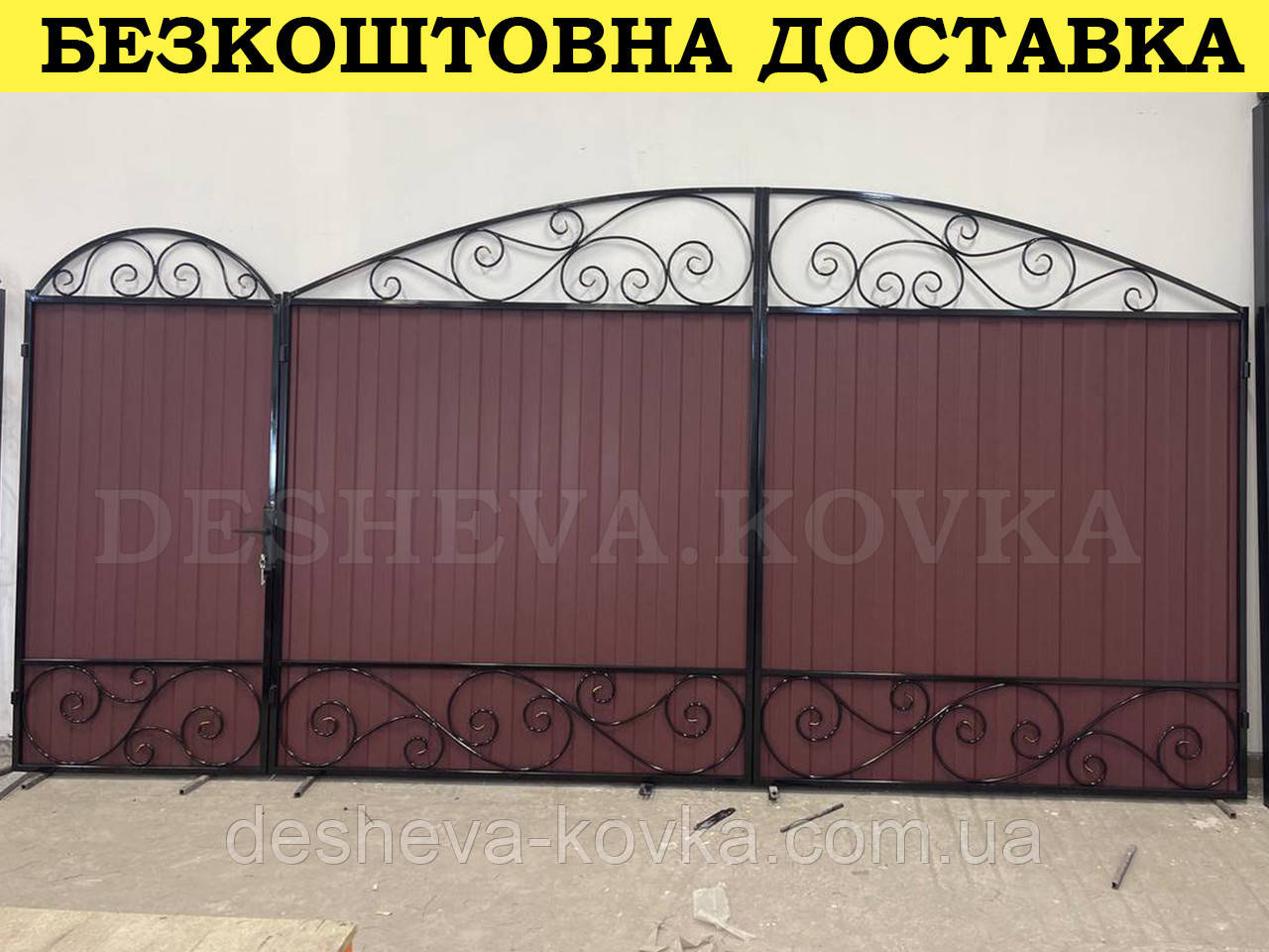Кованые ворота из профнастилом и элементами ковки Код: А-0144 Мы изготовим ворота индивидуально по вашим размерам за 4 рабочих дня. Наши ворота производятся на современном оборудовании специалистами нашей компании, что гарантирует скорость и качество. Уличные ворота из профнастила отлично подходят для обустройства въезда во двор частного дома. Классические конструкции не зря пользуются спросом на протяжении нескольких веков: они хорошо выполняют свои функции, оставаясь простыми и удобными в использовании. Изделие может иметь любую форму и дизайн: из-за его технических особенностей ограничений в возможностях декорирования практически нет. БЕСПЛАТНАЯ доставка по всей Украине! (Доставка курьером до Вашего дома, в любой город/село Украины.) По желанию заказчика калитка может быть справой или с левой стороны. Стандартные размеры: Ворота: 3.4м х 1.7м по столбикам. Калитка: 0.9м х 1.7м по столбикам. Также мы можем изготовить ворота индивидуально по размерам заказчика. Цвет профнастила по выбору! Наша компания является одним из самых больших производств на рынке Украины. Звоните и мы Вас проконсультируем +380965364101.