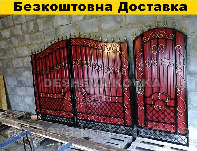 Ворота из калиткой из профнастила Код: А-01187 Мы изготовим ворота индивидуально по вашим размерам за 4 рабочих дня. Наши ворота производятся на современном оборудовании специалистами нашей компании, что гарантирует скорость и качество. Уличные ворота из профнастила отлично подходят для обустройства въезда во двор частного дома. Классические конструкции не зря пользуются спросом на протяжении нескольких веков: они хорошо выполняют свои функции, оставаясь простыми и удобными в использовании. Изделие может иметь любую форму и дизайн: из-за его технических особенностей ограничений в возможностях декорирования практически нет. БЕСПЛАТНАЯ доставка по всей Украине! (Доставка курьером до Вашего дома, в любой город/село Украины.) По желанию заказчика калитка может быть справой или с левой стороны. Стандартные размеры: Ворота: 3.4м х 1.7м по столбикам. Калитка: 0.9м х 1.7м по столбикам. Также мы можем изготовить ворота индивидуально по размерам заказчика. Цвет профнастила по выбору! Наша компания является одним из самых больших производств на рынке Украины. Звоните и мы Вас проконсультируем +380965364101.