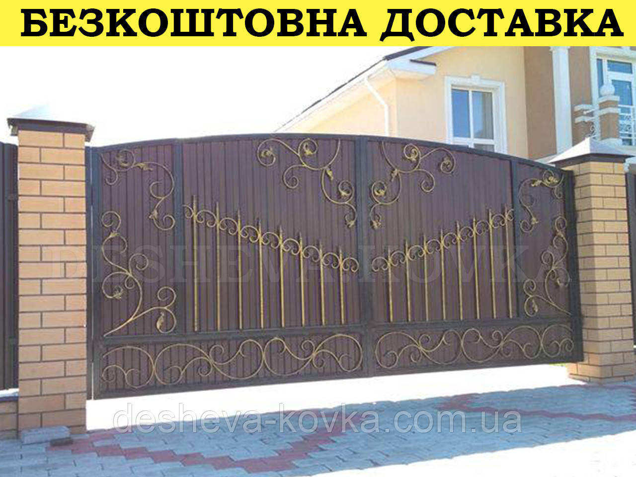 Ворота кованые из профнастилом и калиткой Код: А-01233 Мы изготовим ворота индивидуально по вашим размерам за 4 рабочих дня. Наши ворота производятся на современном оборудовании специалистами нашей компании, что гарантирует скорость и качество. Уличные ворота из профнастила отлично подходят для обустройства въезда во двор частного дома. Классические конструкции не зря пользуются спросом на протяжении нескольких веков: они хорошо выполняют свои функции, оставаясь простыми и удобными в использовании. Изделие может иметь любую форму и дизайн: из-за его технических особенностей ограничений в возможностях декорирования практически нет. БЕСПЛАТНАЯ доставка по всей Украине! (Доставка курьером до Вашего дома, в любой город/село Украины.) По желанию заказчика калитка может быть справой или с левой стороны. Стандартные размеры: Ворота: 3.4м х 1.7м по столбикам. Калитка: 0.9м х 1.7м по столбикам. Также мы можем изготовить ворота индивидуально по размерам заказчика. Цвет профнастила по выбору! Наша компания является одним из самых больших производств на рынке Украины. Звоните и мы Вас проконсультируем +380965364101.